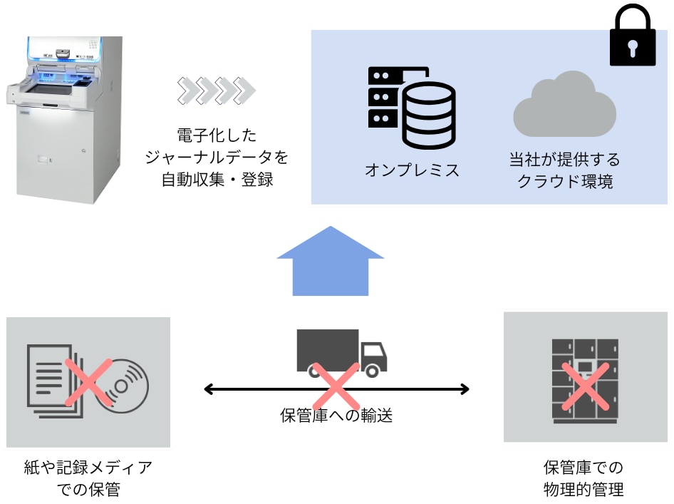 A. | 現在、ATMジャーナルデータを紙媒体・記録メディアで保管管理等されている場合は、以下のような効果が期待できます。 また、今後のサービス拡張により、ATMジャーナルデータを利活用することで、以下が可能となる予定です。 |