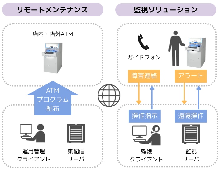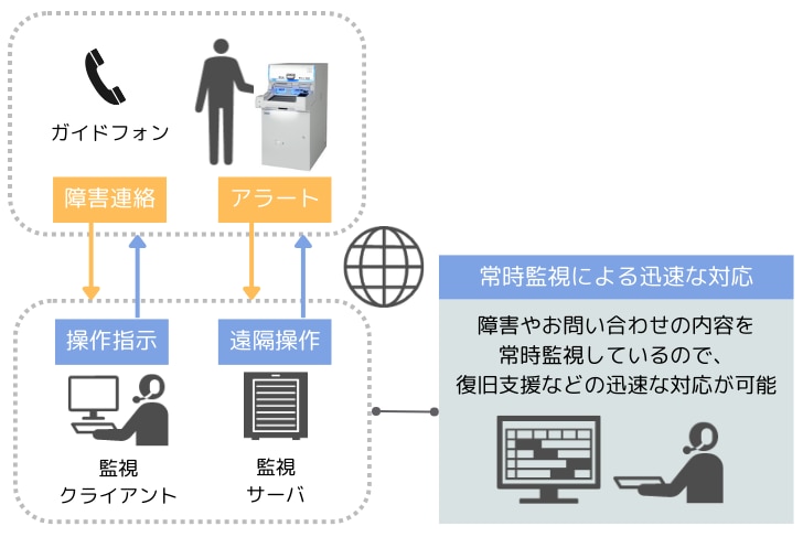 ATMの稼働状況を常時監視することで、機器から発信されるアラートを早期に検知・把握することが可能です。また、ガイドフォン経由でのお客さまからのお問い合わせや障害連絡に対しても、遠隔操作による迅速な障害復旧対応が可能となり、サービス継続性と運用効率の向上に寄与します。