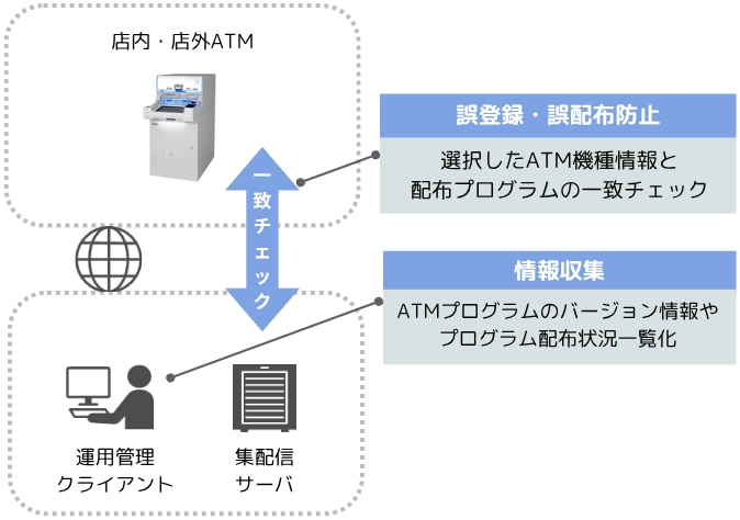 特定ATMの機種情報と、登録・配布済みのATMプログラムとの整合性チェックを実施することで、プログラムの誤登録や誤配信を未然に防止します。これにより、運用ミスによる障害リスクの軽減と安定したサービス提供が図れます。